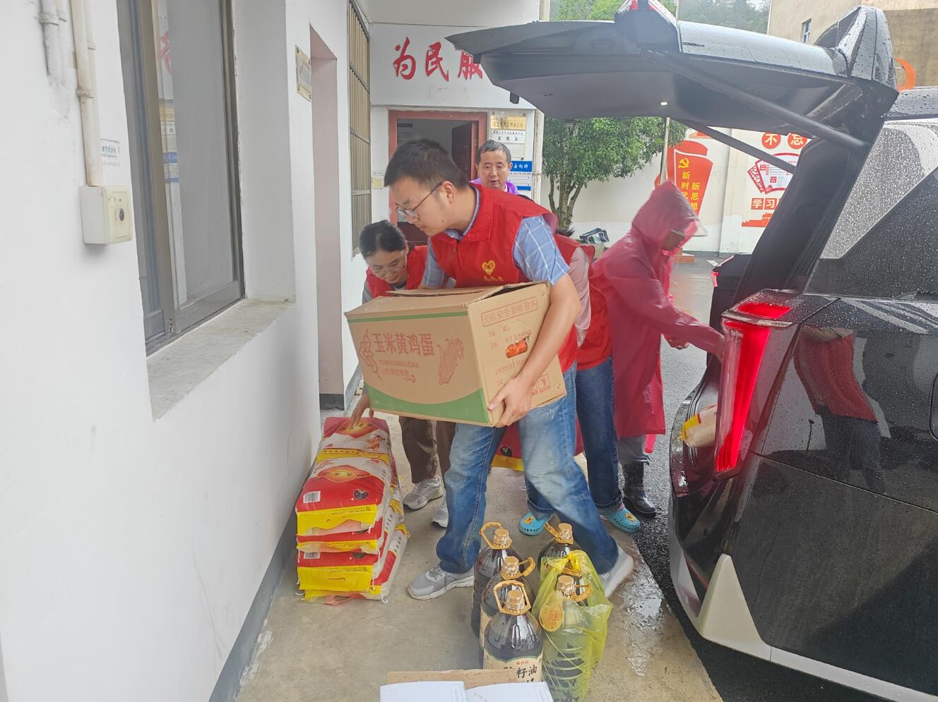上圖為:采購米、油和雞蛋等生活急需物資送到上豐鄉(xiāng)災(zāi)民安置點(diǎn)